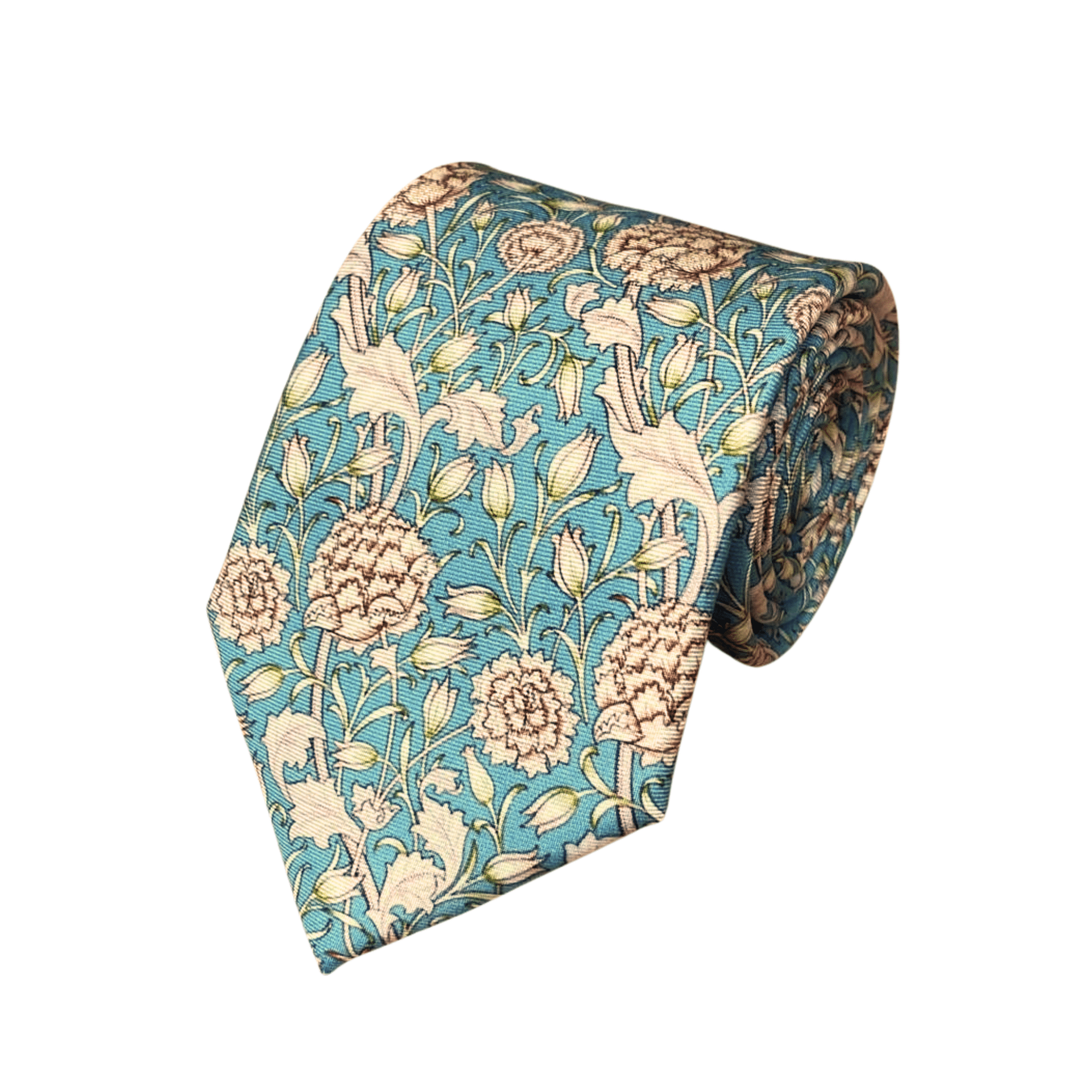 A pale blue Fox & Chave silk tie with pale pink tulip blooms and stylised carnations after a textile design by William Morris (1834-1896).