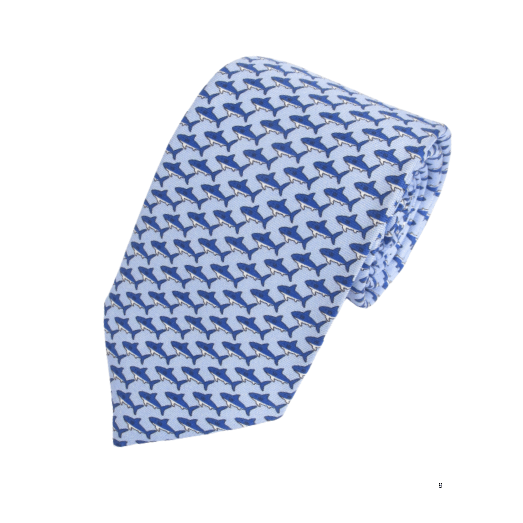 Made in Italy, this Van Buck tie features a subtle design of small shark motifs set against a blue background.