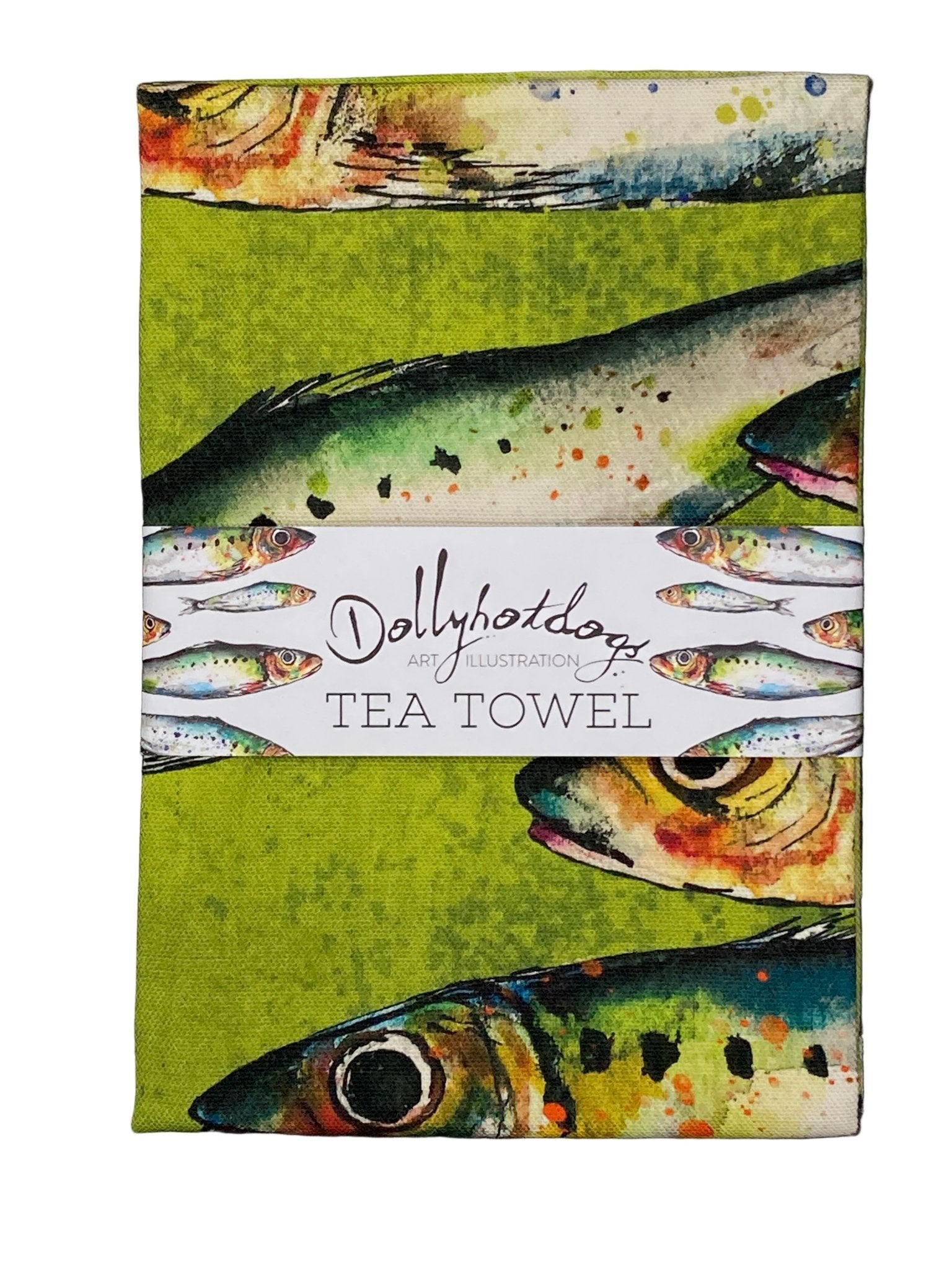 Dollyhotdogs 100% cotton tea towel with a hanging loop.