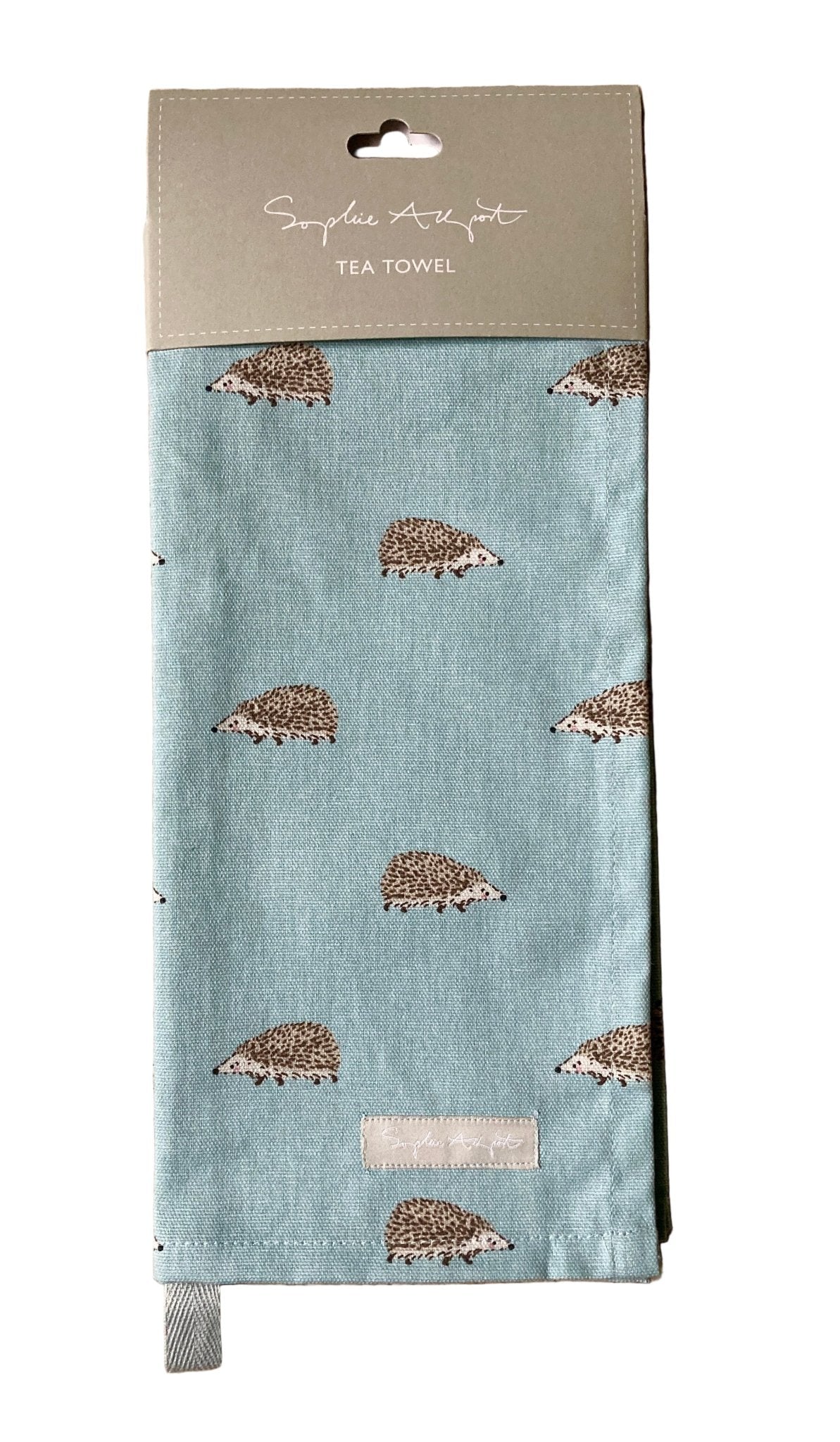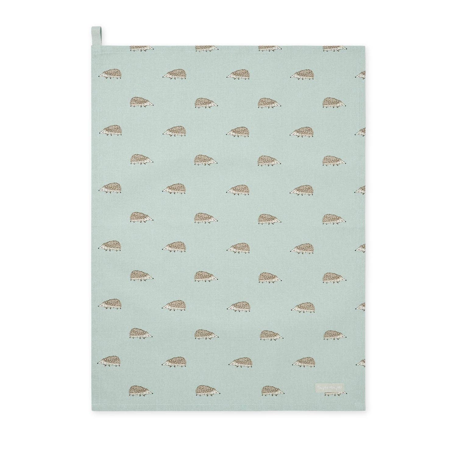 Bring countryside style to your kitchen with this delightful hedgehog patterned tea towel in pale mint blue.