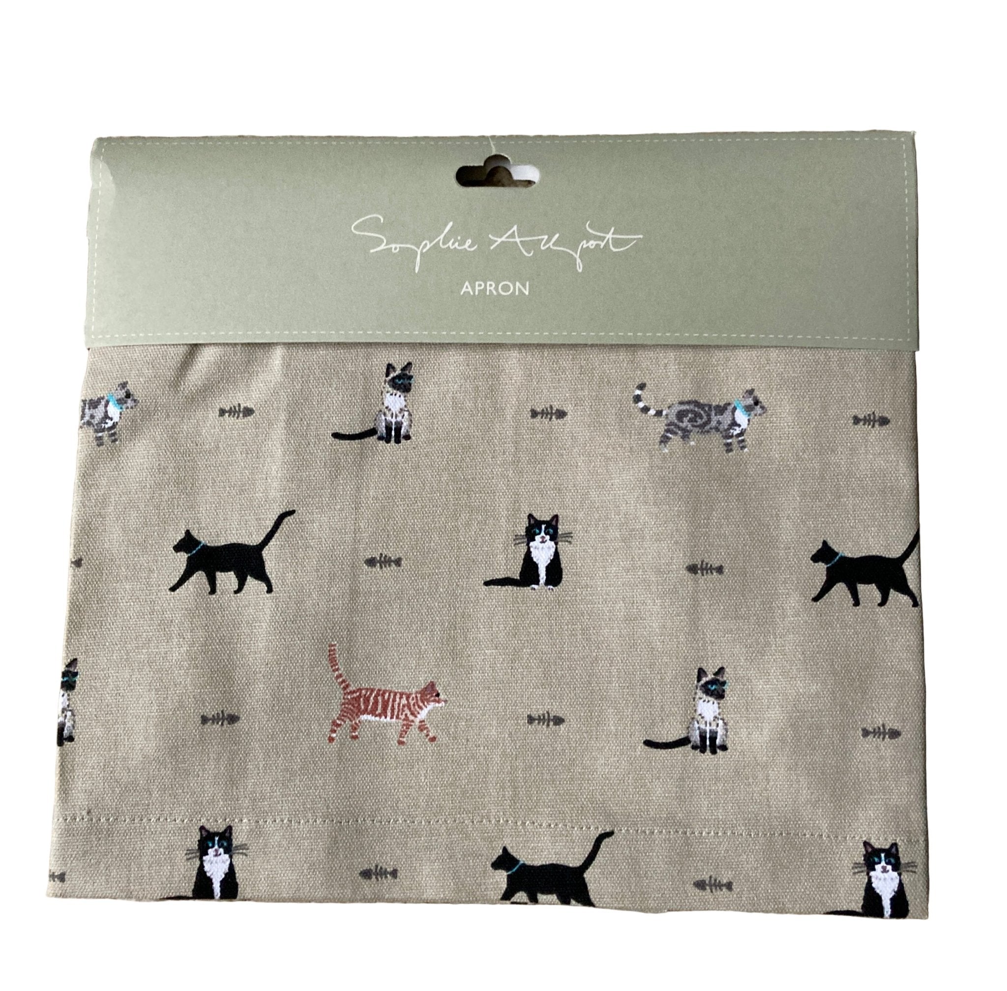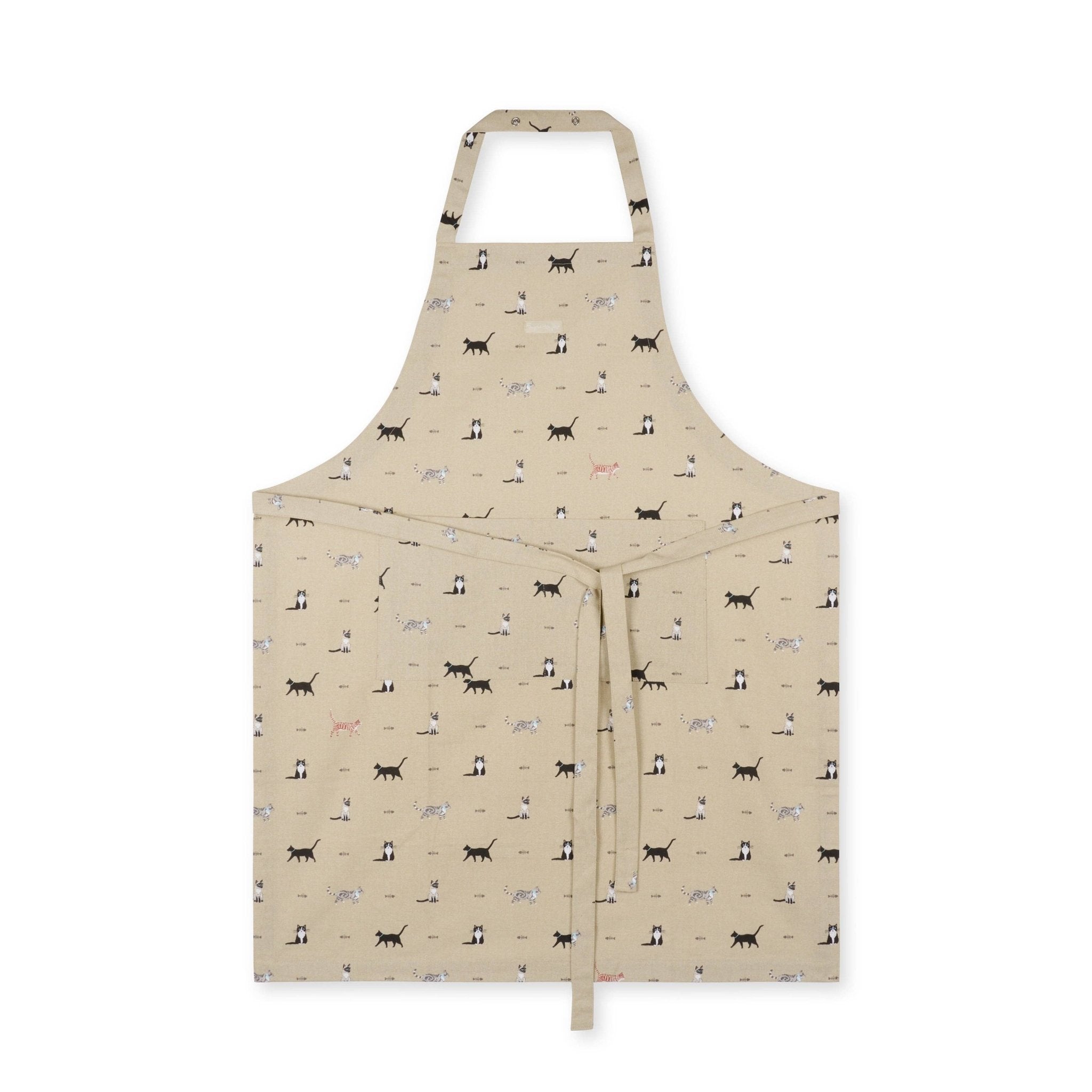 Keep your clothes free from baking mess and protect yourself from cooking spillages, with this 'Purrfect' cat design apron. The fabric is covered in black, tabby, Siamese, ginger and black & white cats on a wheat beige background. There are some fun grey fish bones dotted between the cats.