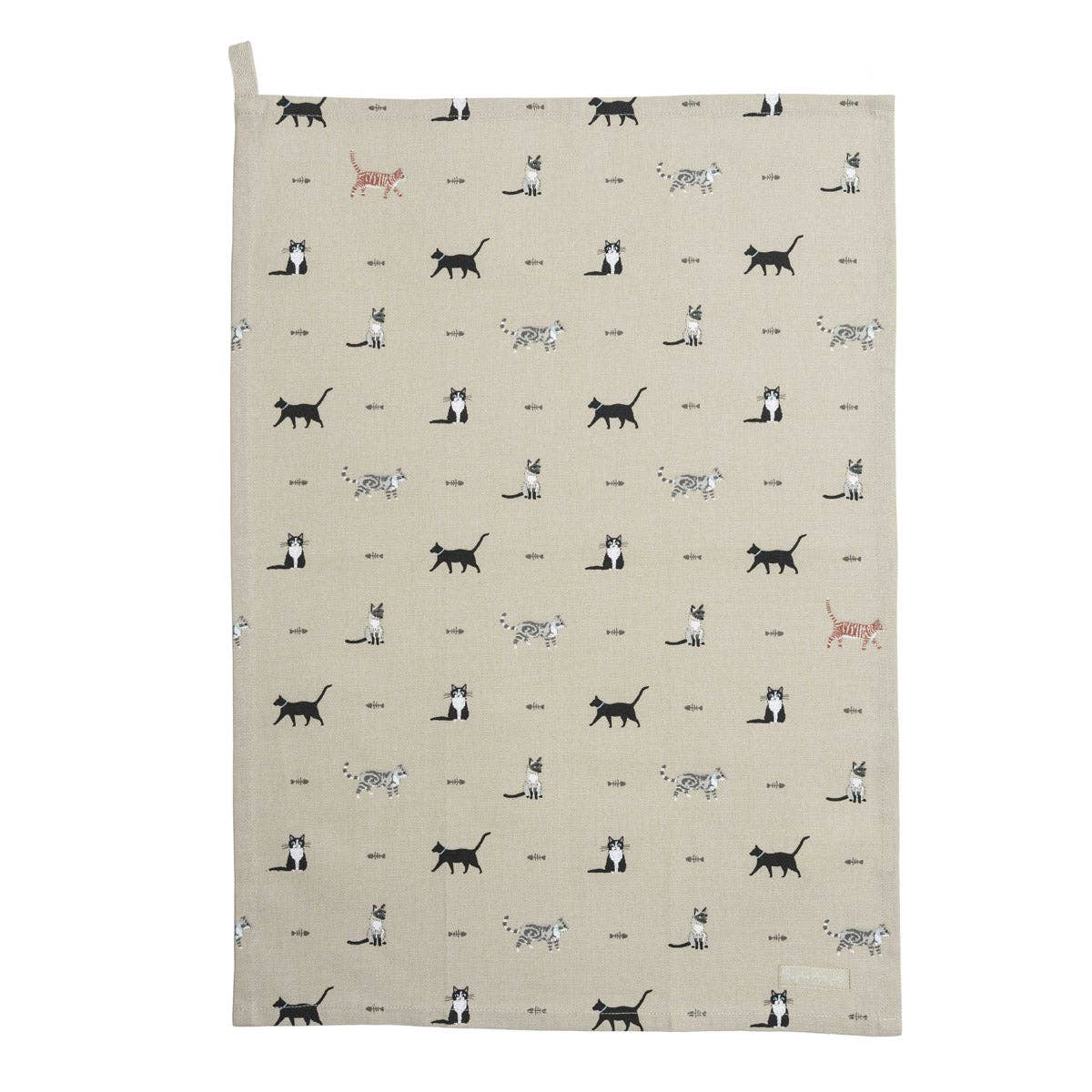 This lovely tea towel is covered in black, tabby, black & white, Siamese, and ginger cats on a wheat beige background.